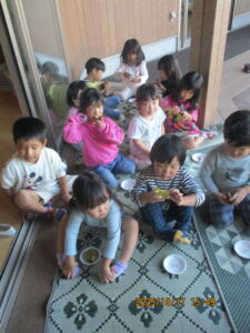 さわやかな風が心地よいので今日はテラスでおやつにしましょう。と、「おいしいおいしい」と食べました。皮ごとかぶりつく子、皮を丁寧に剥く子、皮だけを食べる子、おいしい場所はひとそれぞれちがっています。