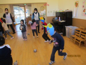 節分の日。鬼のお面を作って豆まきです。